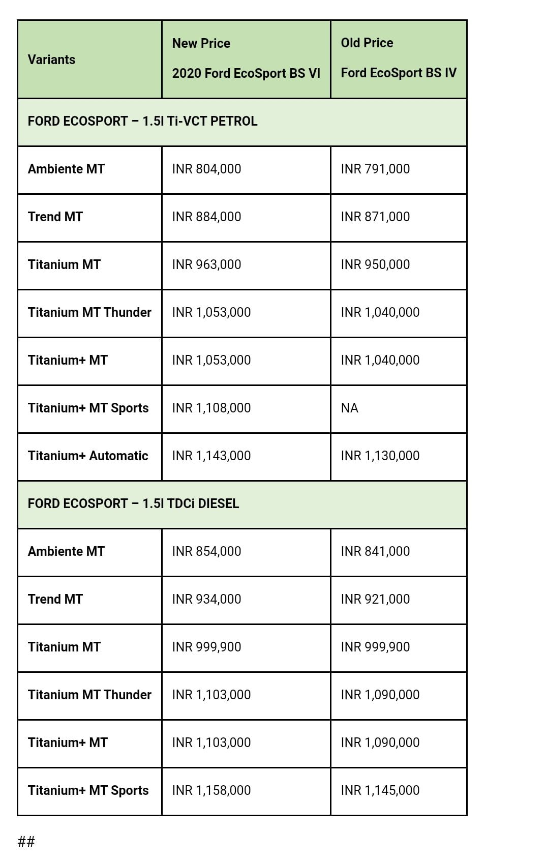 2020 Ford EcoSport BS6 Launched with updated, Bharat Stage VI emission norm compliant petrol & diesel engines at attractive prices starting from INR 804,000 & INR 854,000 respectively.