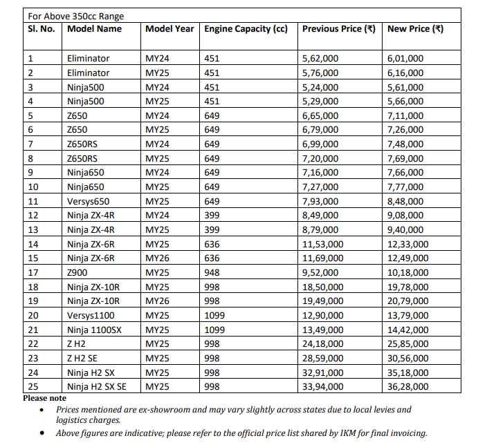 2025 Kawasaki India Entire Portfolio GST Price Revision Revealed (2)