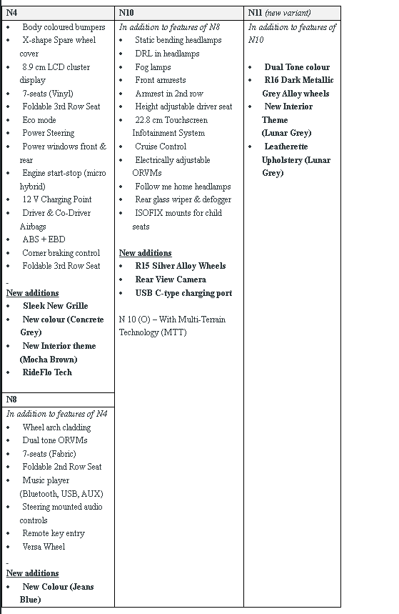 Comfort is prioritised with leatherette upholstery and enhanced seat ergonomics. The 22.8 cm infotainment system is complemented with a rear-view camera and a USB C-type charging port. The advanced ride & handling tech – RideFlo – along with MTV-CL and Frequency Dependent Damping (FDD) ensure smooth rides even on tough roads, with enhanced steering feedback, precision handling, and improved brake dynamics. Powered by the mHAWK100 engine delivering power of 73.5 kW and 260 Nm torque, the Bolero Neo includes cruise control and Multi-Terrain Technology (MTT) for enhanced traction over broken roads through a locking differential. New colours include Jeans Blue and Concrete Grey and three dual-tone options, along with existing Diamond White, Stealth Black, Pearl White, and Rocky Beige.
