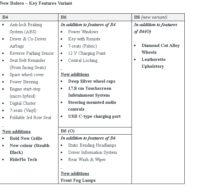 Inside, the Bolero offers a new 17.8 cm touchscreen infotainment & music system, steering-mounted controls, and leatherette upholstery with enhanced seat comfort. The advanced ride & handling tech – RideFlo – delivers enhanced stability & control, with improved suspension architecture, engineered for any terrain. The Bolero’s core DNA remains unchanged and uncompromised, powered by the mHAWK75 engine delivering power of 55.9 kW and 210 Nm torque, with body-on-frame construction. New colour option includes Stealth Black, along with existing Diamond White, DSAT Silver, and Rocky Beige.