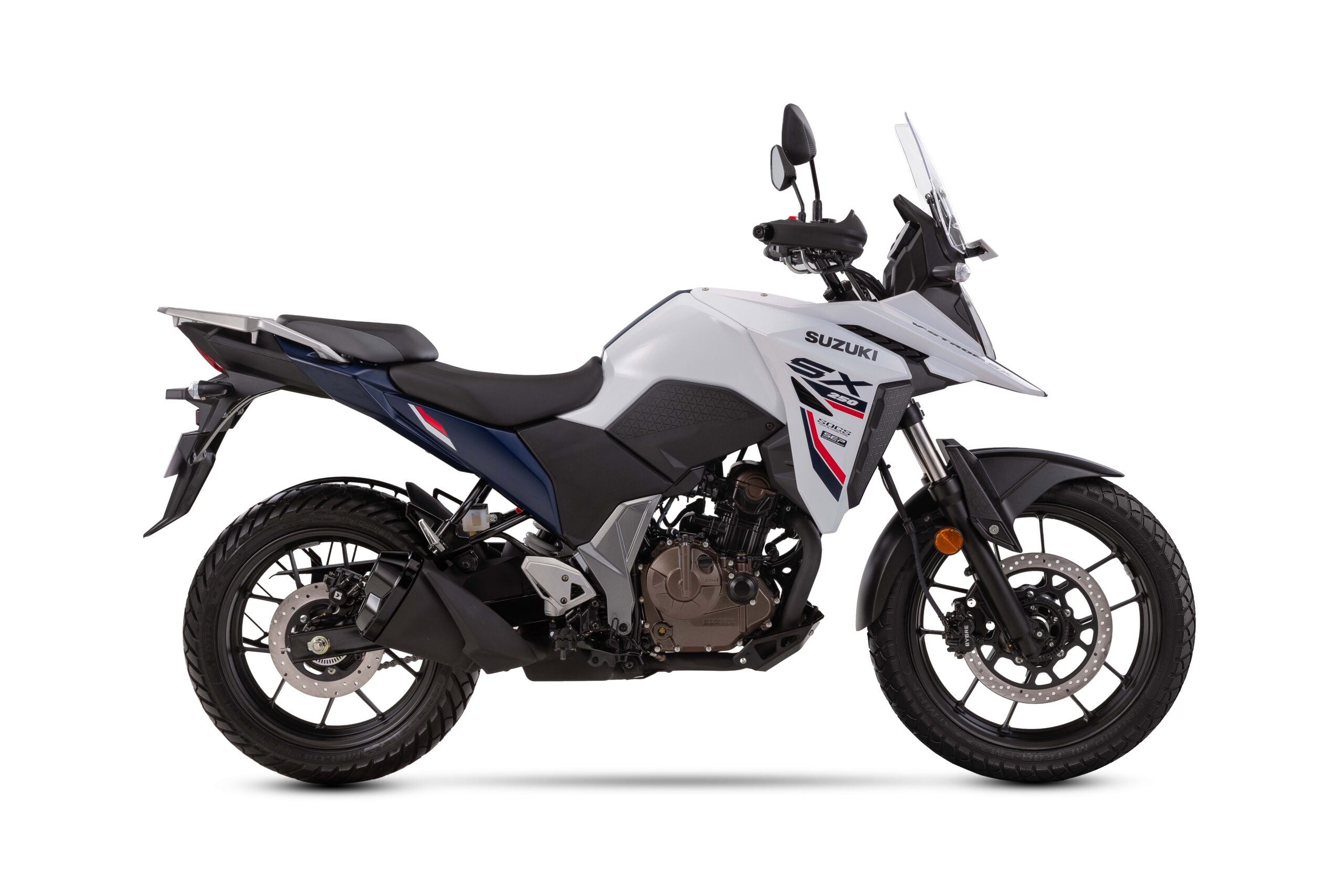 The new colour options include Pearl Fresh Blue + Glass Sparkle Black, Champion Yellow No. 2 + Glass Sparkle Black, Pearl Glacier White + Metallic Mat Stellar Blue, and Glass Sparkle Black. Sport-inspired graphics hint at the V-STROM SX’s sporty side, while a textured pattern on the side panels enhances both the look and feel of the motorcycle.
