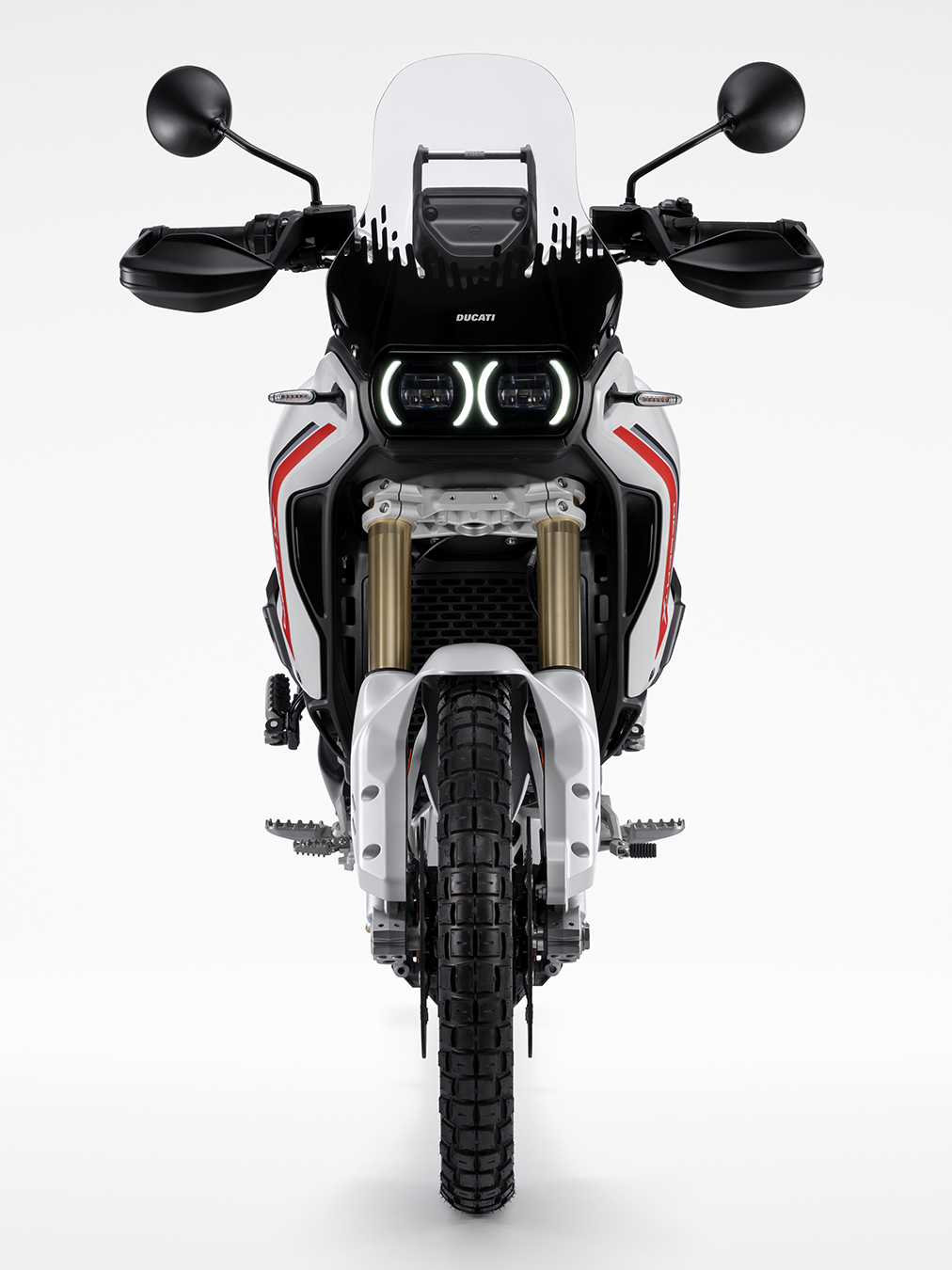 The braking system is by Brembo, with M4.32 monobloc calipers, new 305 mm discs, dedicated pads and an axial pump with a newly designed lever, offering the rider greater modulation off-road and improved lever feel, while maintaining optimal braking power for road use. The new braking system also allows even the most off-road-oriented enthusiasts to fit the high front mudguard without the need for additional kits.
