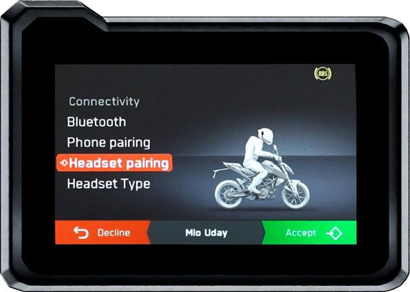 This function allows the rider to see the identification of incoming calls on the TFT display and, using the mode switch, accept or decline the call. As a safety measure, accessing the phone’s address book and making outgoing calls is not possible while riding.