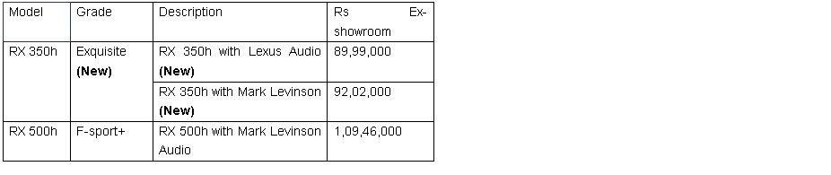 The introduction of the new RX 350h Exquisite grade starting at Rs 89,99,000 Ex-showroom onwards offers guests a wider range of options and features to choose from, while staying true to Lexus’ commitment to advanced technology and exceptional comfort. The pricing of RX 350h and RX 500h, reflect Lexus’ continued focus on delivering outstanding value.