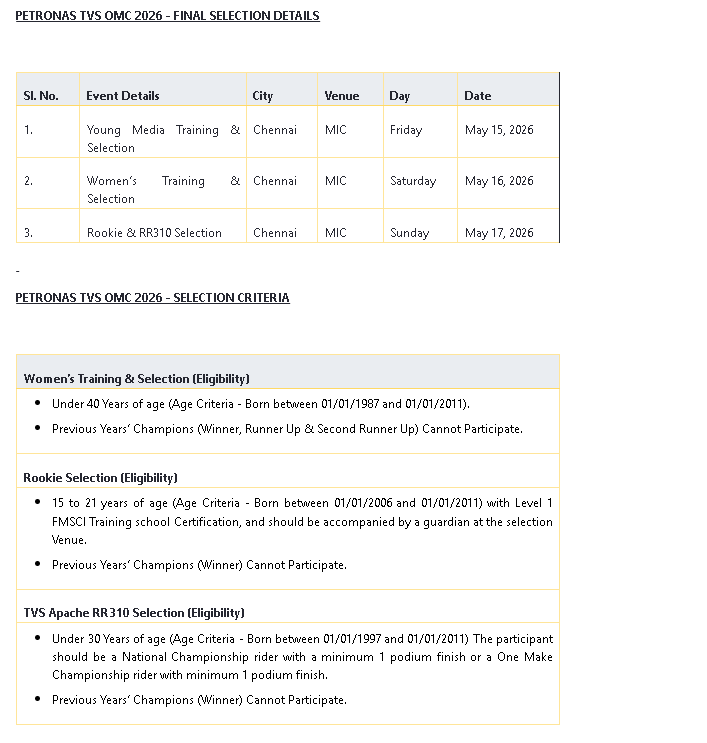 Commenting on the new season, Vimal Sumbly, Head Business – Premium, TVS Motor Company, said, “For TVS Racing, the One Make Championship has always been about building racers, not just organising races. This platform has helped identify, train and race-prepare talent through structured on-track learning, professional racing standards and a strong safety culture. As TVS Apache marks 20 years of racing-derived performance engineering, the 2026 PETRONAS TVS India One Make Championship brings our racing DNA to life by making track racing accessible, disciplined and aspirational. This is how we continue to strengthen India’s motorsports ecosystem for the next generation of racers.”