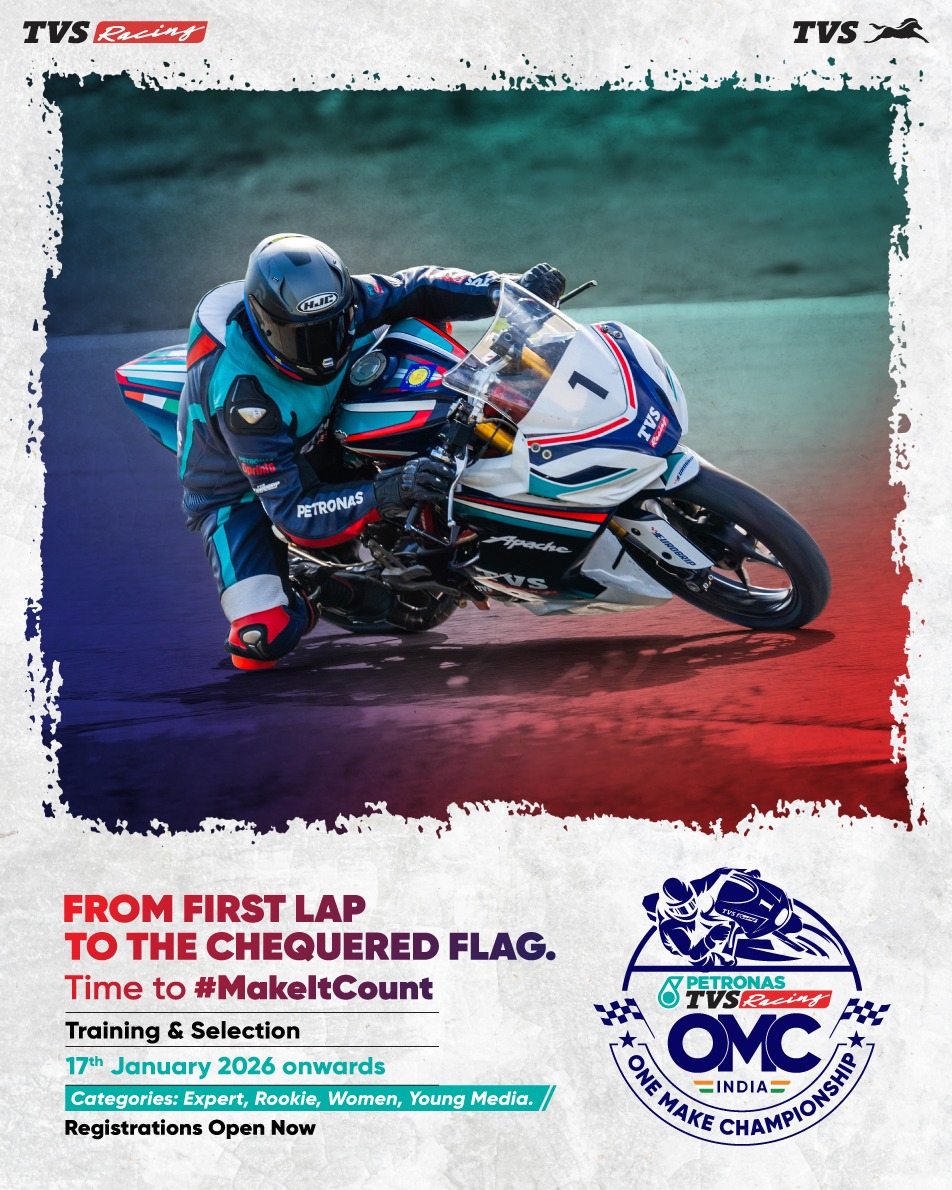 TVS Motor Company (TVSM), a leading global automaker in the two- and three-wheeler segments, today announced the PETRONAS TVS India One Make Championship (OMC) 2026 Training and Selection Program, reaffirming TVS Racing’s long-standing role as enabler of competitive racing talent in India. The nationwide selection trials will be conducted between January 17 and February 7, 2026, across Bengaluru, Pune, Delhi and Kolkata, followed by final selections at the Madras International Circuit (MIC), Chennai.
