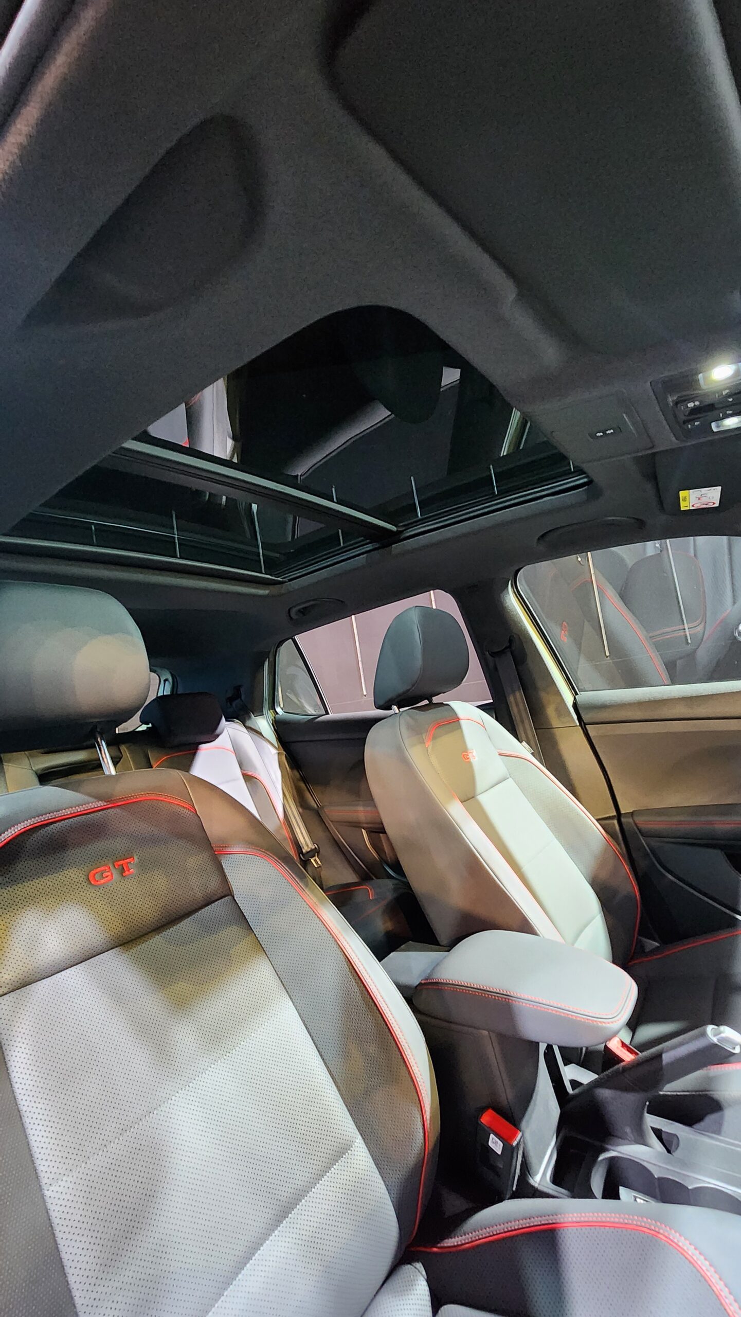 embroidery; GT Sport in black leatherette with red piping and stitching