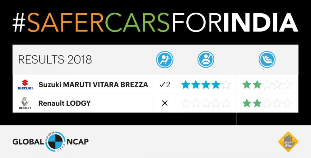 2018 Global New Car Assessment Programme (GNCAP) announced crash test results for Three Indian cars including Maruti Vitara Brezza, TATA Nexon and Renault’s’ Lodgy. The Maruti’s SUV Vitara Brezza and TATA’s SUV Nexon both made in India scored an impressive Four Star rating in the latest crash tests.