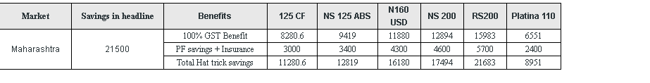 The offer applies pan-India across the entire Pulsar range and is available for a limited period only, giving customers a final opportunity to maximize year-end savings. Please find attached the table for Maharashtra Pulsar Hattrick savings: