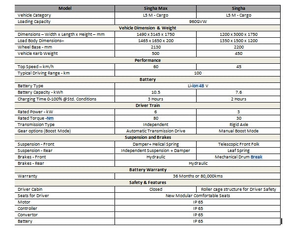 Smart EV vehicles Singha and Singha Max are powered by swappable Li-ion battery, with a 100 km range on a single charge having a capacity of 500kg cargo. With Li-ion 48 v battery and max torque of 80 NM, Singha & Singha Max offer 45 Kmph and 60 Kmph of top speed respectively. The instrument cluster of Singha is embedded with an App to capture data through telematics and cloud computing on vehicle positioning, running and mileage data, best route tracking etc.