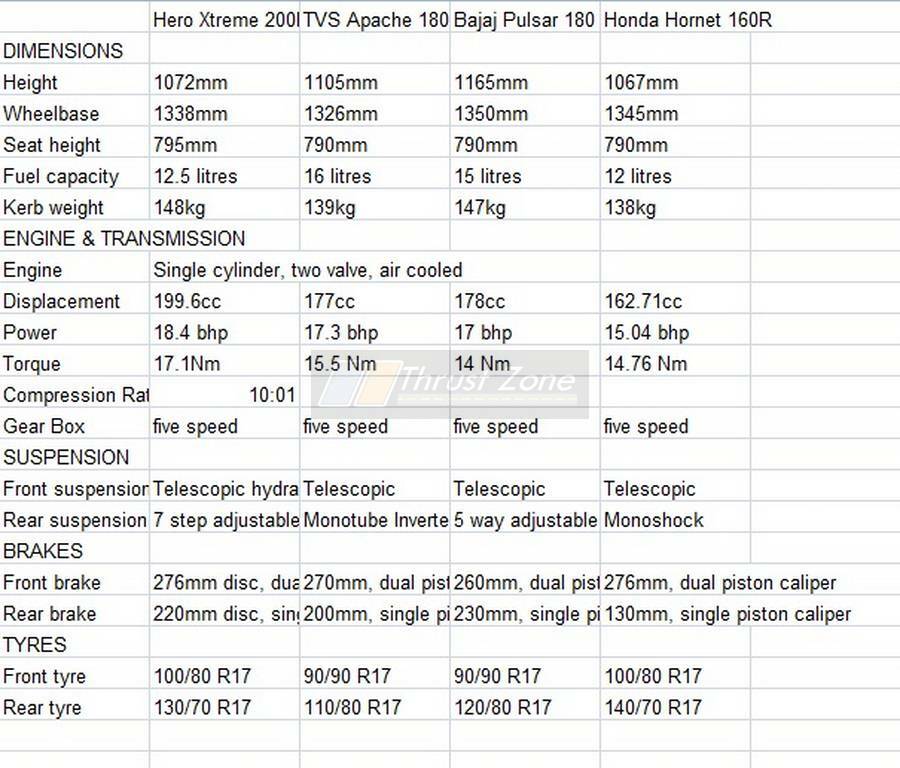 Hero Xtreme 200R Vs Apache 180 VS Pulsar 180 Vs Hornet 160R – Specification Comparison