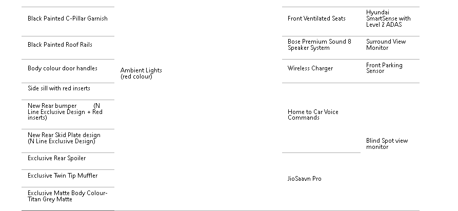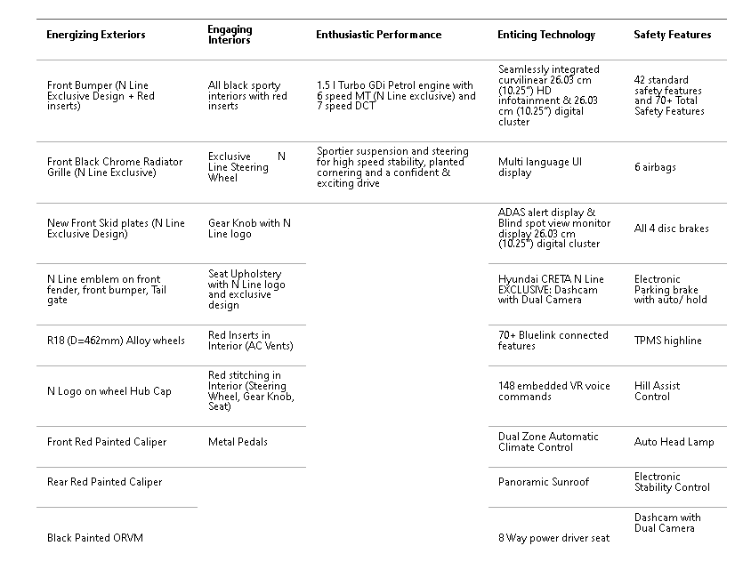 Hyundai CRETA N Line offers over 70 Bluelink connected car features and integrated 148+ VR voice commands further enhance the hands-free experience. A panoramic sunroof, and front ventilated seats, 8-way powered driver seat, etc. which ensures comfort for every journey. The immersive 26.03 cm (10.25”) HD infotainment with inbuilt Jio Saavn and Bose premium sound system and wireless charging. Customers can book the Hyundai CRETA N Line with an initial booking amount of INR 25,000/- at any Hyundai Signature Dealership across India or by clicking on https://clicktobuy.hyundai.co.in/#/bookACar?modelCode=FI.