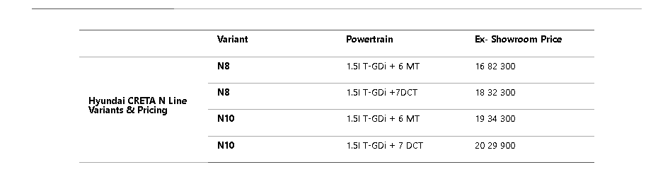 Hyundai CRETA N Line is powered with a 1.5l Turbo GDi engine with a 6 speed manual transmission (N Line EXCLUSIVE) and 7 speed Dual Clutch Transmission (DCT). Sprinting from 0-100 kmph in 8.9 seconds, Hyundai CRETA N Line churns out a max power of 117.5 kW (160 PS) and max torque of 253 Nm.
