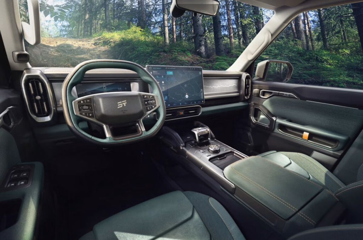 Notable features across higher trims include wireless Apple CarPlay and Android Auto, multi-color ambient lighting, and a premium sound system. Additionally, the T2 incorporates a rotary drive mode selector with settings geared towards off-road capabilities, aligning with its rugged character.
