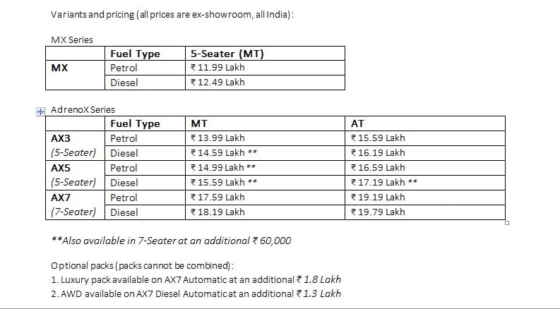 Note: Optional packs will be announced at a later date and will include features like Immersive 3D Sound by Sony, electrically-deployed Smart Door Handles, 360 Surround View, Blind View Monitoring, Electronic Park Brake and Wireless Charging.