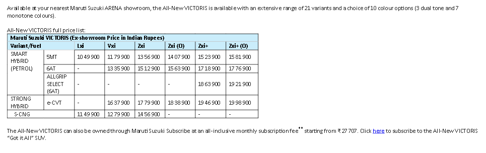 Announcing the prices of the VICTORIS, Mr. Partho Banerjee, Senior Executive Officer, Marketing & Sales, Maruti Suzuki India Limited, said, “We have received an incredible response for the VICTORIS ever since its launch earlier this month. Customers have expressed overwhelming appreciation for the VICTORIS SUV, especially its intelligent technology, hyper-connected features, progressive and sleek design and all-round safety. Building on this euphoria, we are delighted to announce introductory prices for the VICTORIS, starting at ₹ 10 49 900. Armed with versatile powertrain options that are tailored for adventurous and environmentally responsible buyers of today, the VICTORIS is powered by high-end technologies such as Strong Hybrid, ALLGRIP Select, S-CNG and Smart Hybrid. With its robust performance, 5-star safety~ and cutting-edge features, the VICTORIS truly has ‘Got It All’—making it aspirational, yet accessible for today’s youthful SUV customers who seek experiential lifestyles.”