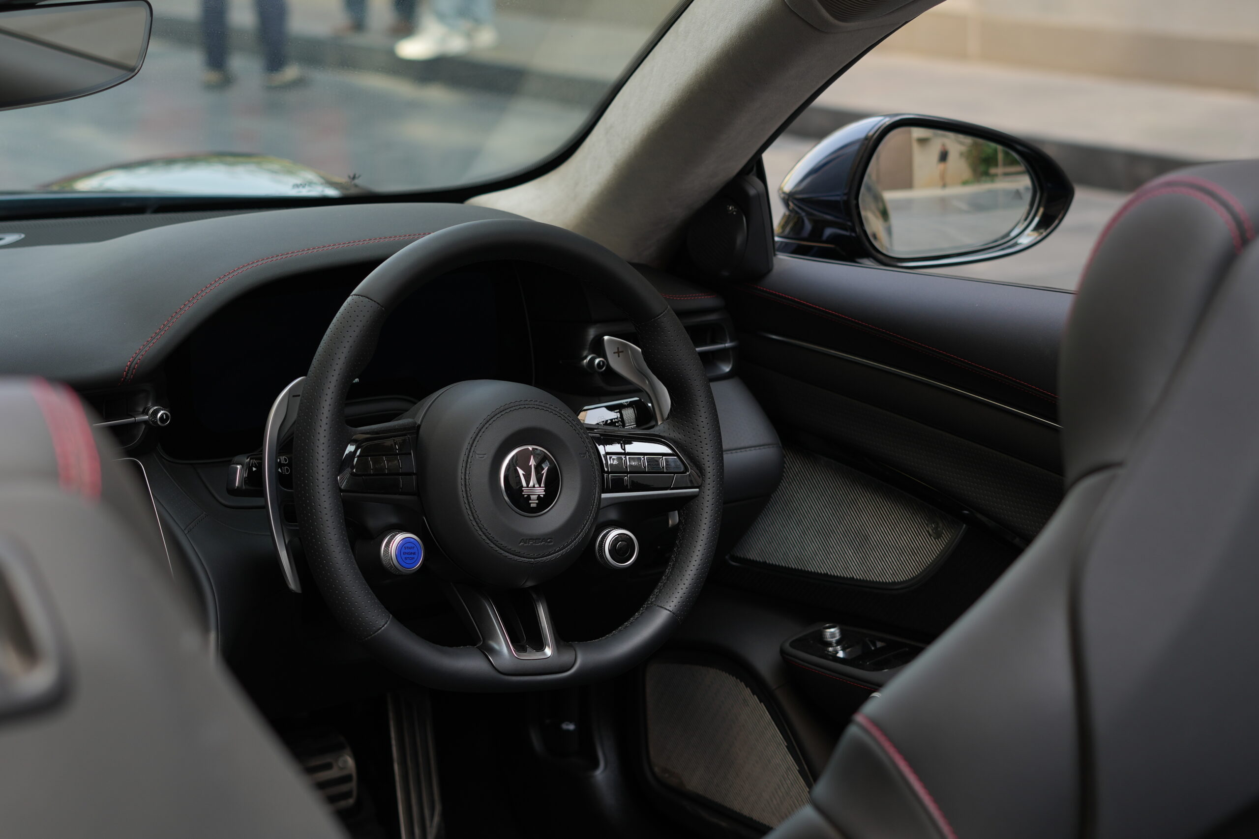 The interior is tailored in Nero leather with striking Rosso stitching across the seats, dashboard, and door panels. The cabin is further accented by matte carbon fibre weave trim, reinforcing the Trofeo’s performance DNA while maintaining a refined luxury aesthetic.