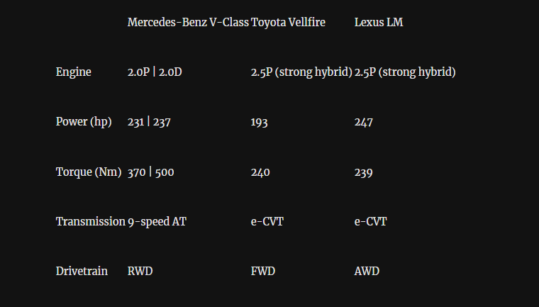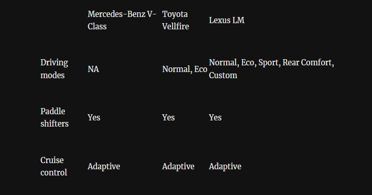 Inside the cabin, each MPV delivers a premium experience anchored by 12.3-inch driver displays. The V-Class uniquely offers third-row seat ventilation, a highly desirable comfort feature, but falls short in a few technological aspects compared to its rivals. It lacks the rear entertainment screens, head-up display, powered sunblinds, and sunroofs that are available on the Vellfire and the feature-heavy Lexus LM. The Lexus also stands out by offering a highly customizable 4-seat configuration alongside its 7-seat version, whereas the V-Class offers 4-seat and 6-seat layouts, and the Vellfire strictly seats seven.