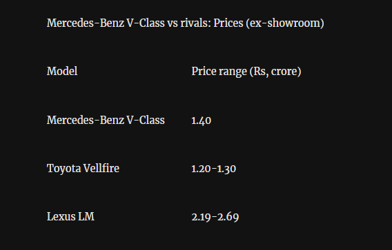 The Mercedes-Benz V-Class has made a comeback in the Indian luxury MPV segment, launching with a starting price of Rs 1.40 crore to compete directly against the Toyota Vellfire and the Lexus LM. When it comes to size, the V-Class dominates in length and wheelbase, stretching 245mm longer than the Lexus LM and offering a massive 430mm wheelbase advantage over both of its Japanese competitors. However, it does sit slightly lower in overall height compared to both the Toyota and the Lexus.