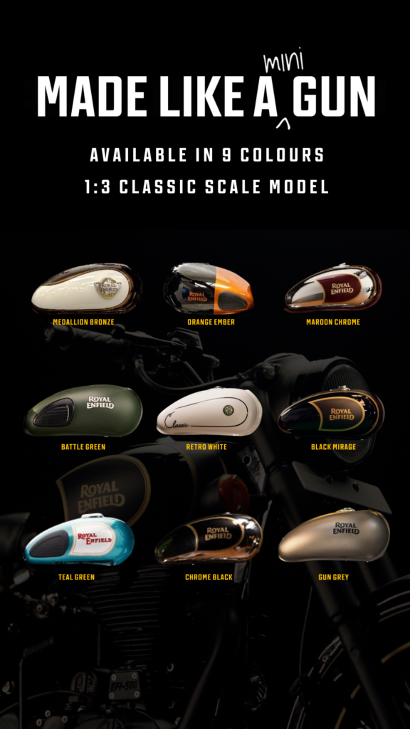 Royal Enfield Apparel has announced the addition oftwo new color variants to its exclusive 1:3 scale model lineup, inspired by the iconic Classic 500. With these new additions, enthusiasts can now choose from a total of nine colors. With Medallion Bronze and Orange Ember as the two new colours – the iconicscale model is now available in total nine colours including the already existing seven striking color variants— Teal Green, Gun Grey, Chrome Black, Maroon Chrome, Battle Green, Black Mirage, and Retro White. These handcrafted miniatures are built with 964individual parts and weigh 8.5 kg to ensure an authentic look and feel.