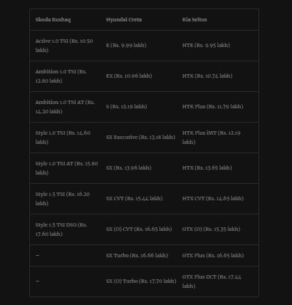 Skoda Kushaq’s price range starts at Rs 10.50 lakh for the base Active petrol 1.0-litre TSI MT variant while in comparison, Hyundai Creta and Kia Seltos starts at marginally cheaper Rs 9.99 lakh and Rs 9.95 lakh respectively. The middle variant in the Kushaq range, i.e., Ambition comes with both manual and automatic transmission options priced at Rs 12.80 lakh and Rs 14.20 lakh respectively. Similar to the Base Active trim, the ambition trim too can be hand only with a 1.0-litre TSI engine. The middle trims EX and S of Creta costs Rs 10.96 lakh and Rs 12.19 lakh while Kia has priced Seltos competitively at Rs 10.74 lakh and Rs 11.79 lakh for HTK and HTK Plus variants.