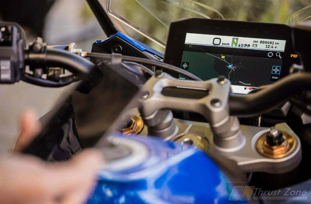 The model features various fine-tuned electronic functions such as the Suzuki Drive Mode Selector (SDMS) with a selection among three different modes for various engine output characteristics, the updated Suzuki Traction Control System (STCS), now with a wider selection of 5-mode settings, and the Bi-directional Quick Shift System, which allows up or down shifting without clutch lever operation.
