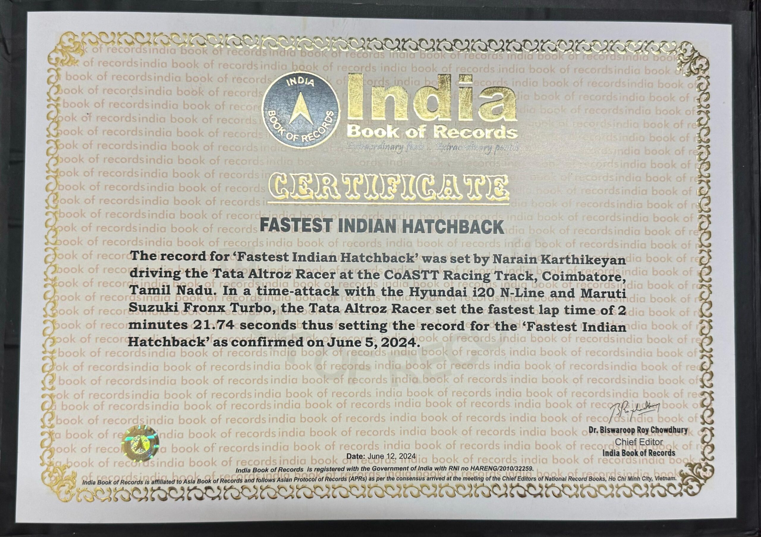 The Tata Altroz ​​, which was recently launched in India at a price of Rs 9.49 lakh (ex-showroom), recently broke the record for the fastest Indian hatchback in Coimbatore, Tamil Nadu. Altroz ​​rider Narain Karthikeyan chased him down and set a lap time of 2:21:74, beating many rivals such as the Hyundai i20 Nline and Maruti Fronx. The Indian Book of Records confirmed this attempt on 5 June 2024.